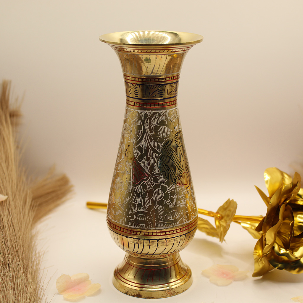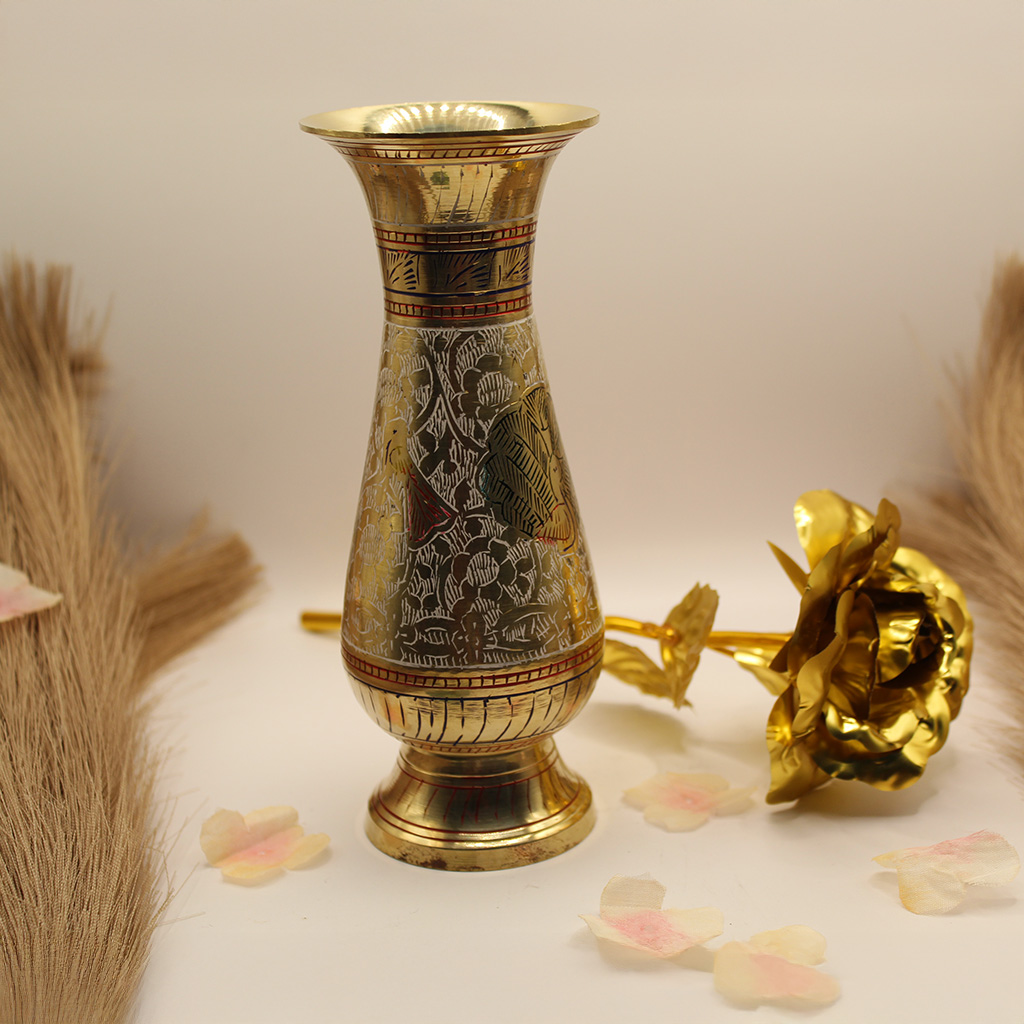 This decorative small pure Brass Vase can be used as a stand alone piece or to display beautiful flowers. It's made of pure Brass and embossed with intricate Meenakari artwork. Each vase is handmade and designed by gifted craftsmen who specialize in working with Brass. A beautiful addition to any space in your home.