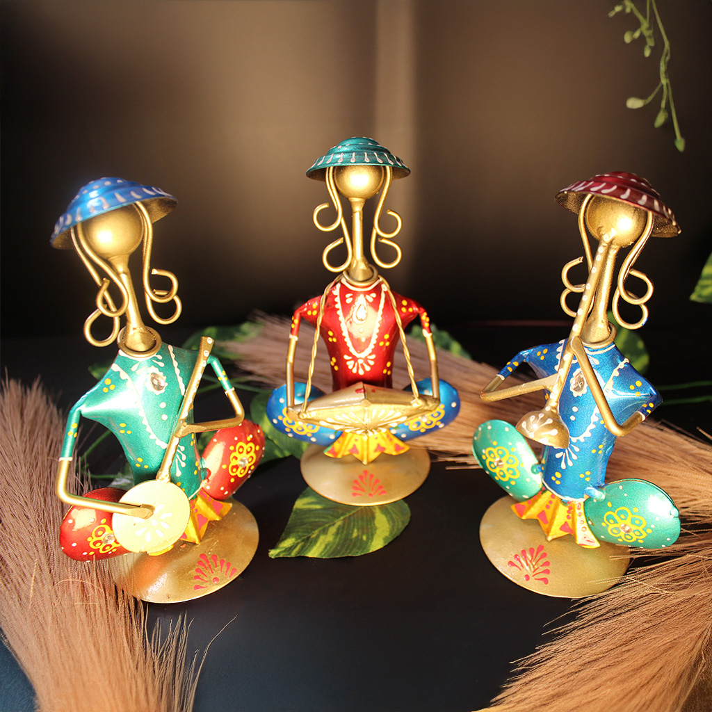This set of 3 Musicians depict the tribal outfits and musical instruments of Rajasthan, India. Intricately handcrafted by talented artisans, these figurines will make a beautiful and unique addition to your home decor. Can be used as a centerpiece or displayed alongside other unique and beautiful artwork.