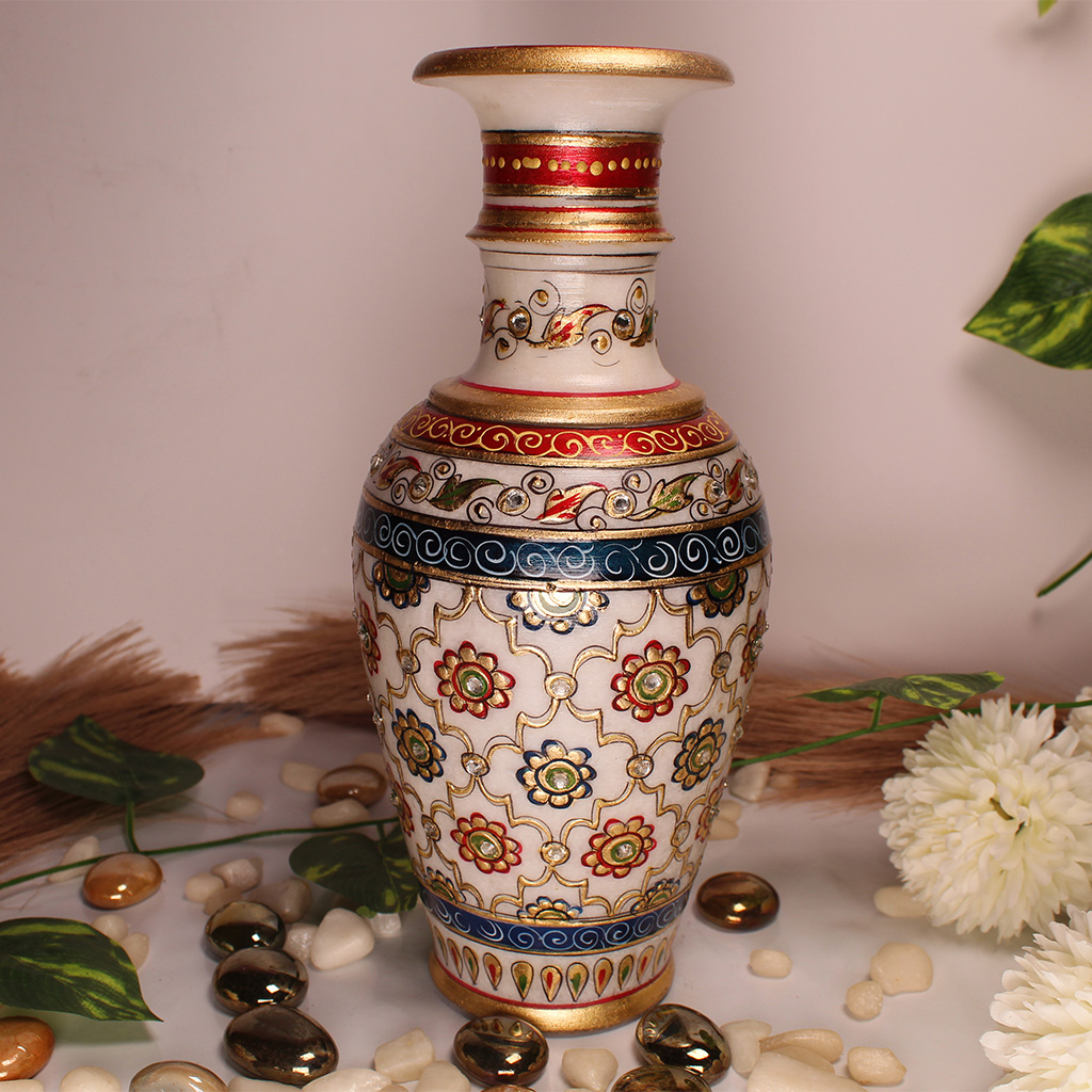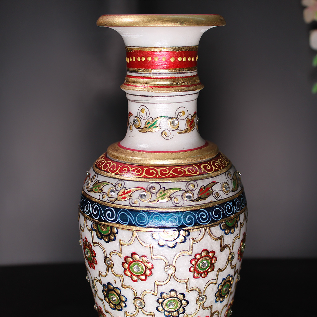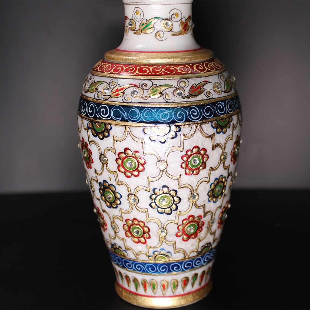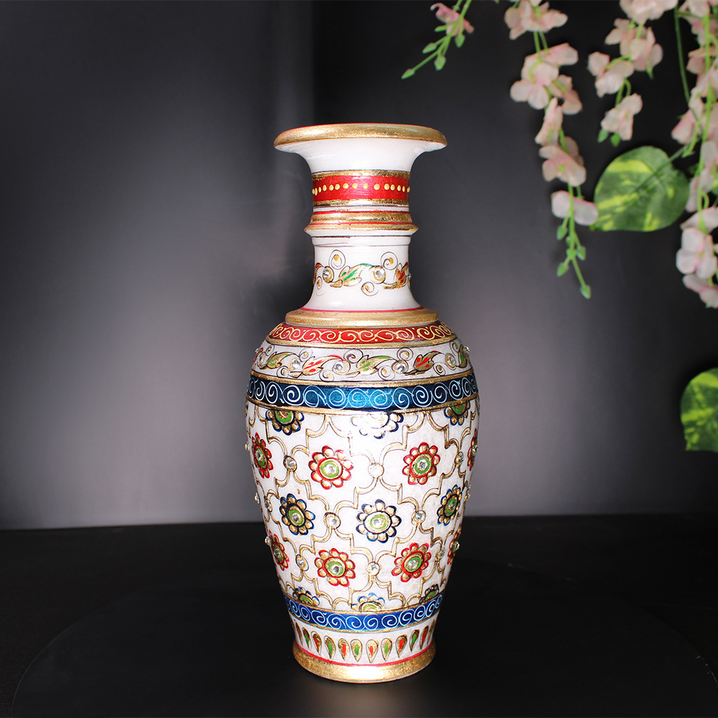 This beautiful Vase is Handmade in Rajasthan, India. Crafted using pure white marble, embellished with Jaipur’s famous Meenakari artwork by skilled and talented Artisans. Each vase is individually made and unique. This colorful and stunning vase will be an elegant and unique addition to your home decor.