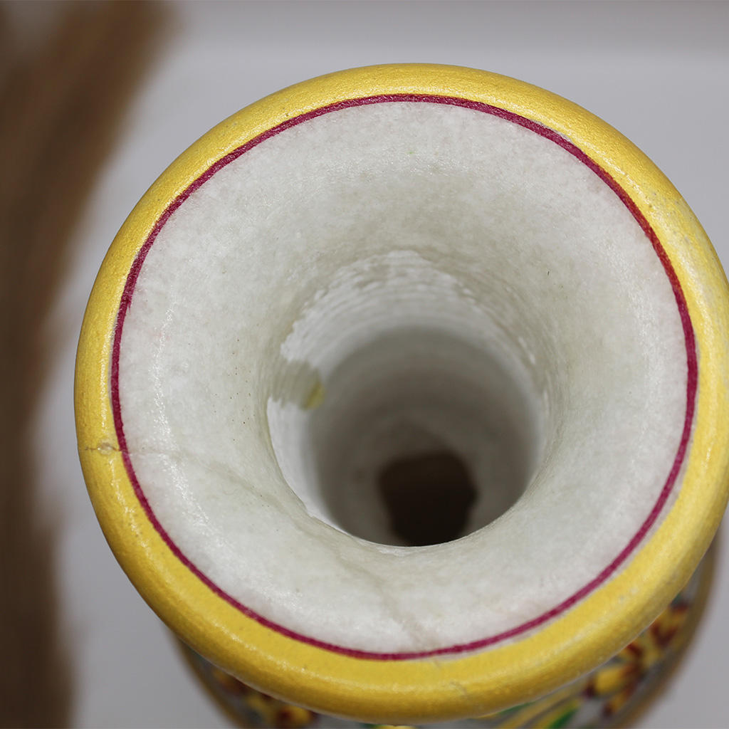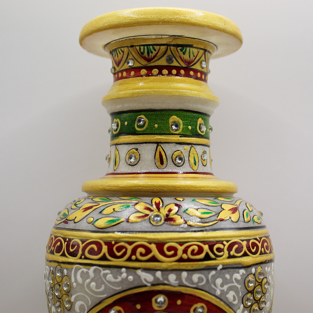 This beautiful Vase is Handmade in Rajasthan, India. Crafted using pure white marble, embellished with Jaipur’s famous Meenakari artwork by skilled and talented Artisans. Each vase is individually made and unique. This colorful and stunning vase will be an elegant and unique addition to your home decor.