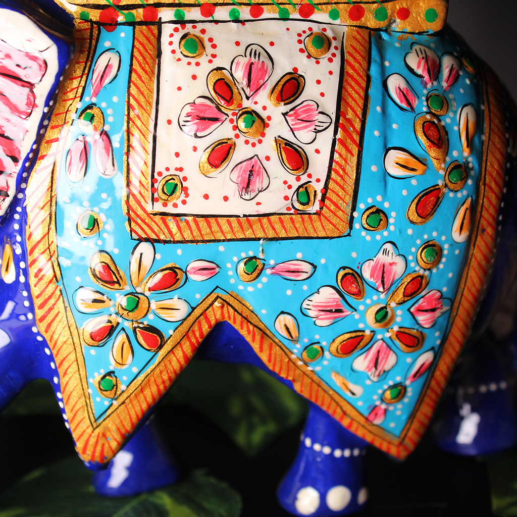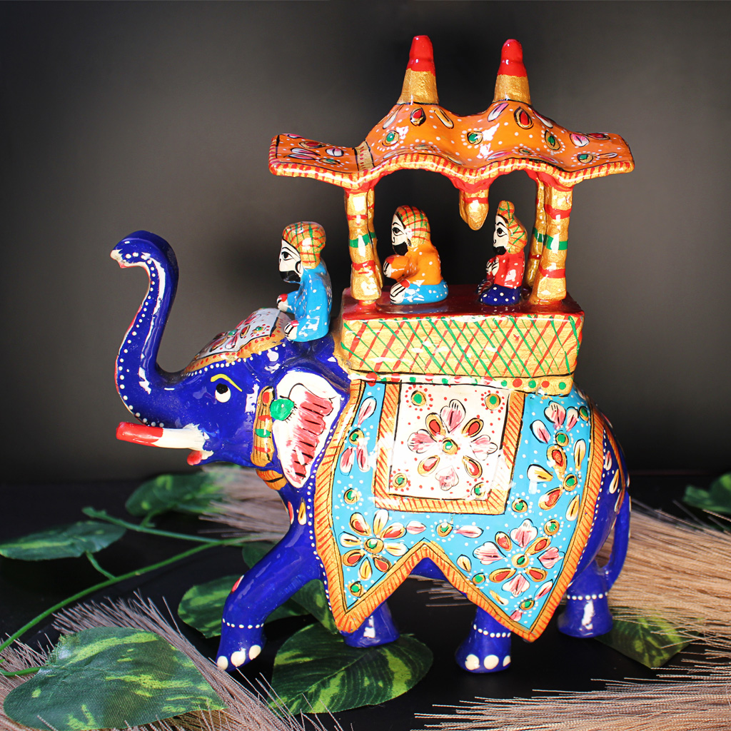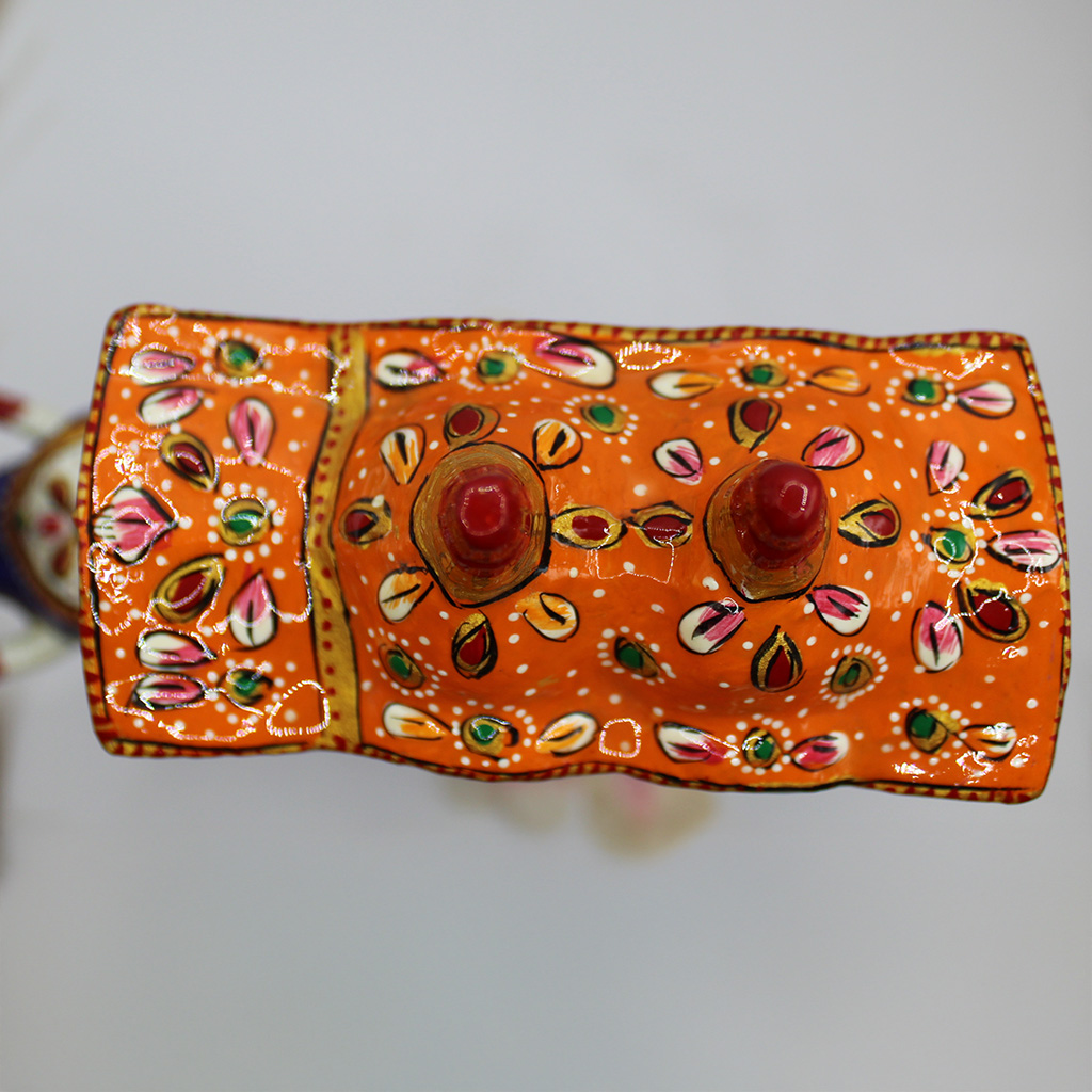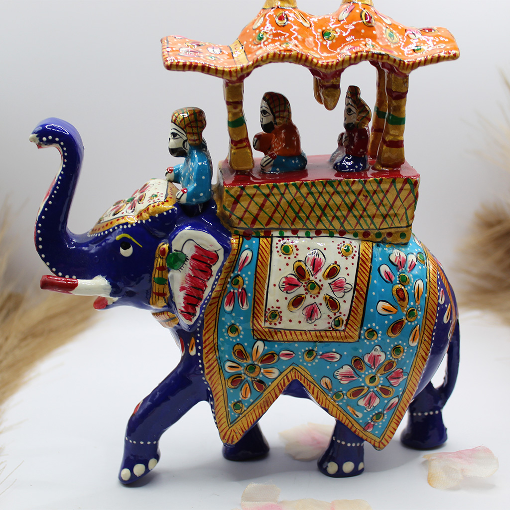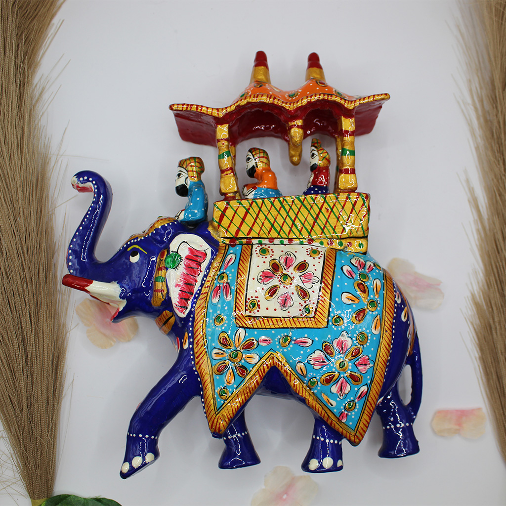 Crafted in metal, this gorgeous Meenakari Ambabari elephant statue is embellished with Jaipur’s famous metal Meenakari work, which is complemented by expert enamelwork. This royal Rajasthani-style Ambabari elephant statue is made by the Meena tribes of Rajasthan. Each piece is handmade by expert artisans and it shows in the exquisite details and colors. This stunning piece can serve as a centerpiece anywhere in your home and garner ample attention, or be displayed among other beautiful pieces. Either way it is sure to garner a ton of attention.